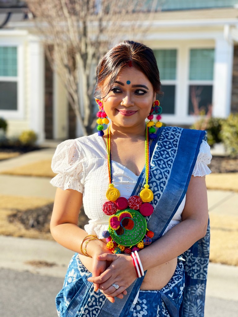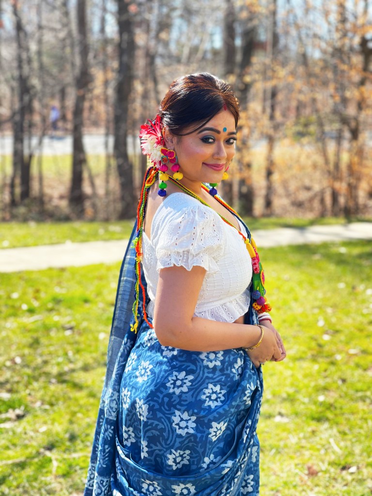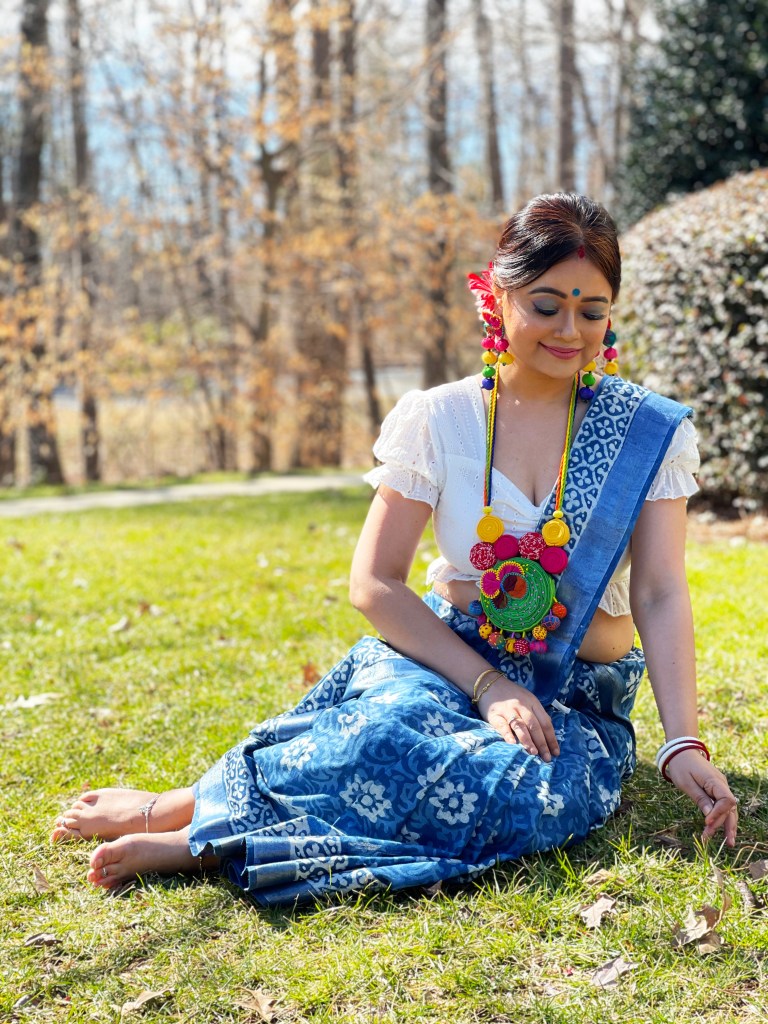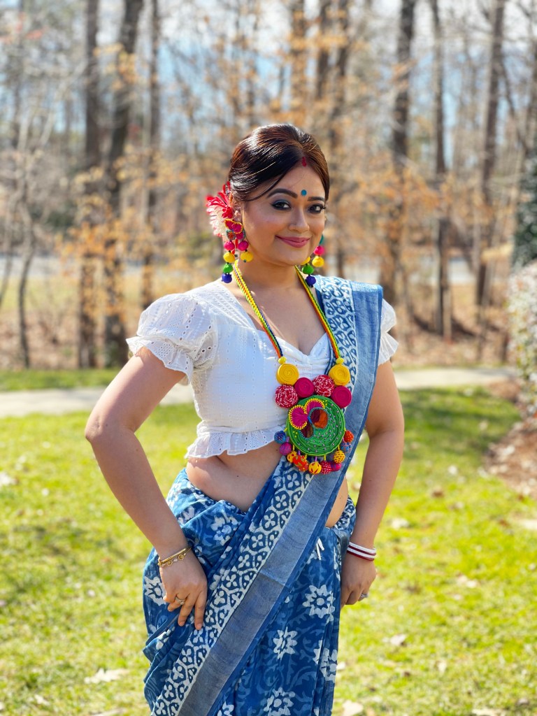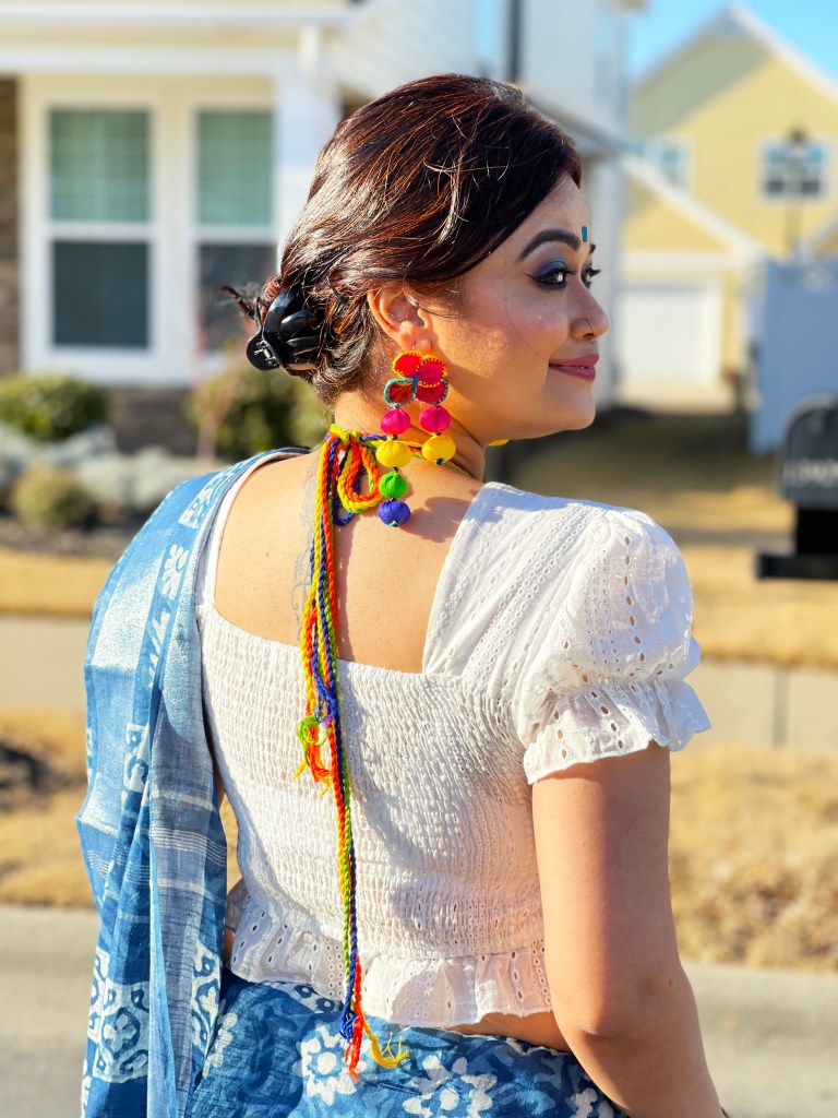 Today, featuring this beautiful indigo cotton saree which I paired with this white crop top. To make this look more vibrant ,added this colorful jewelry and flower to my messy low bun.