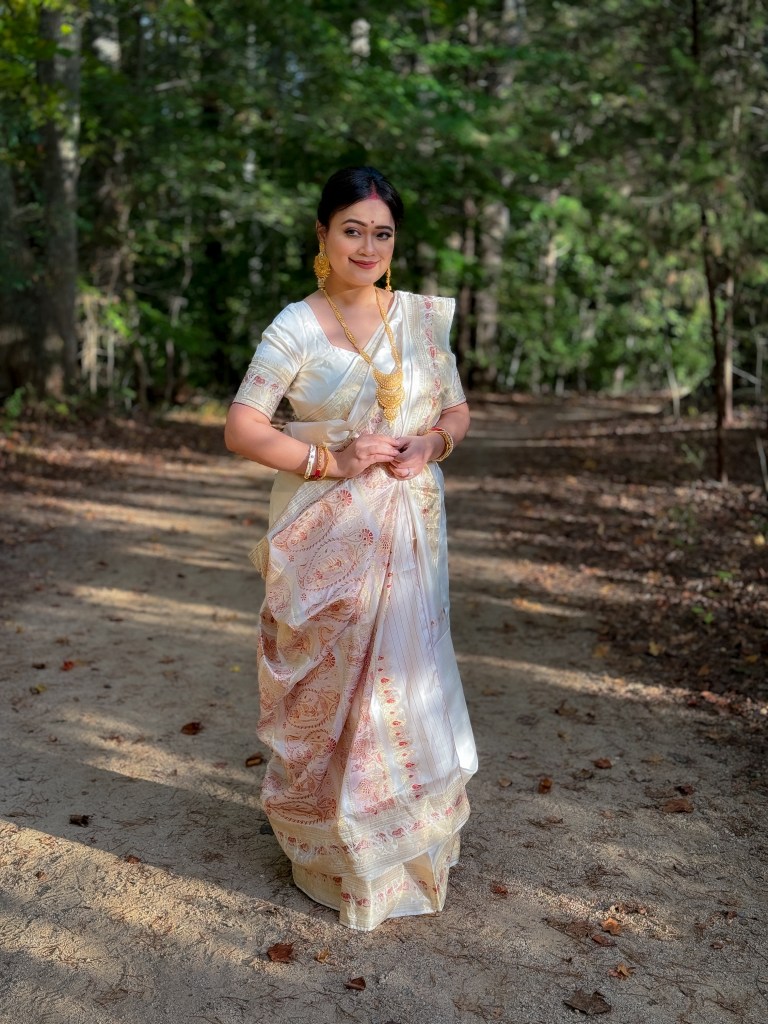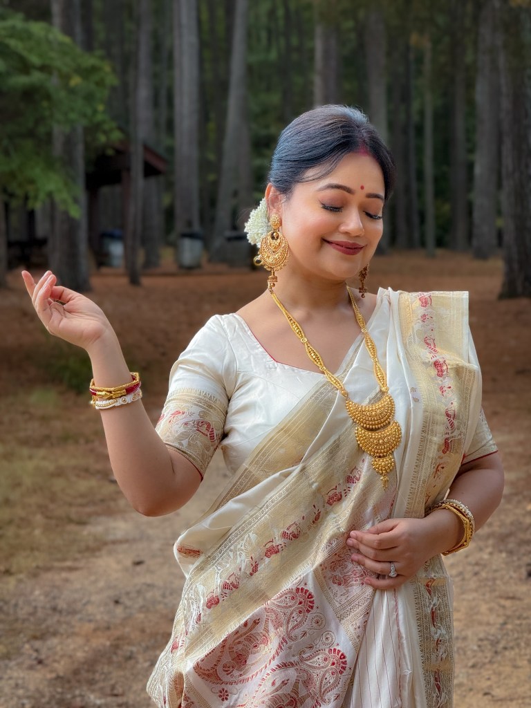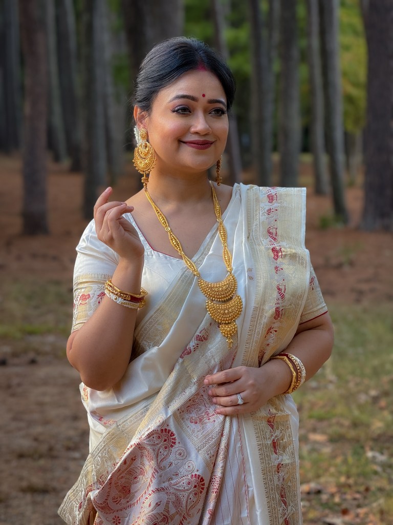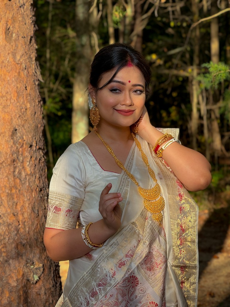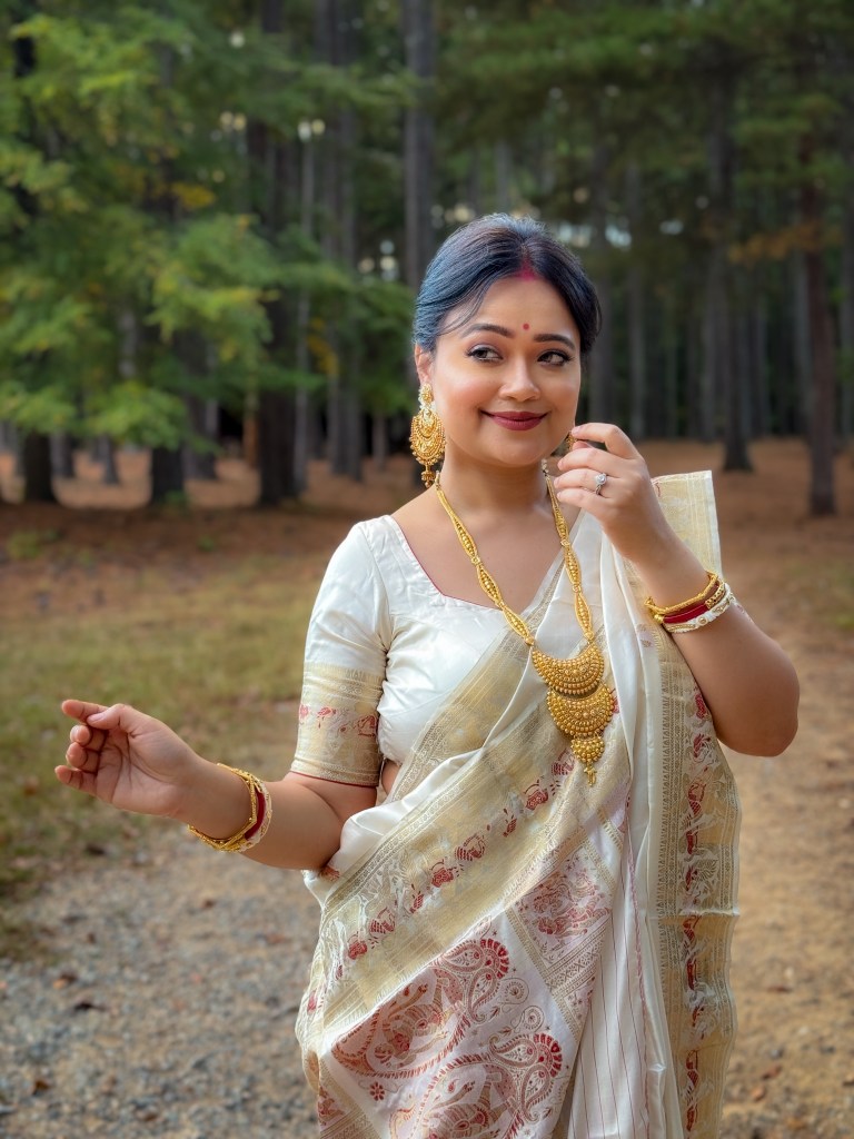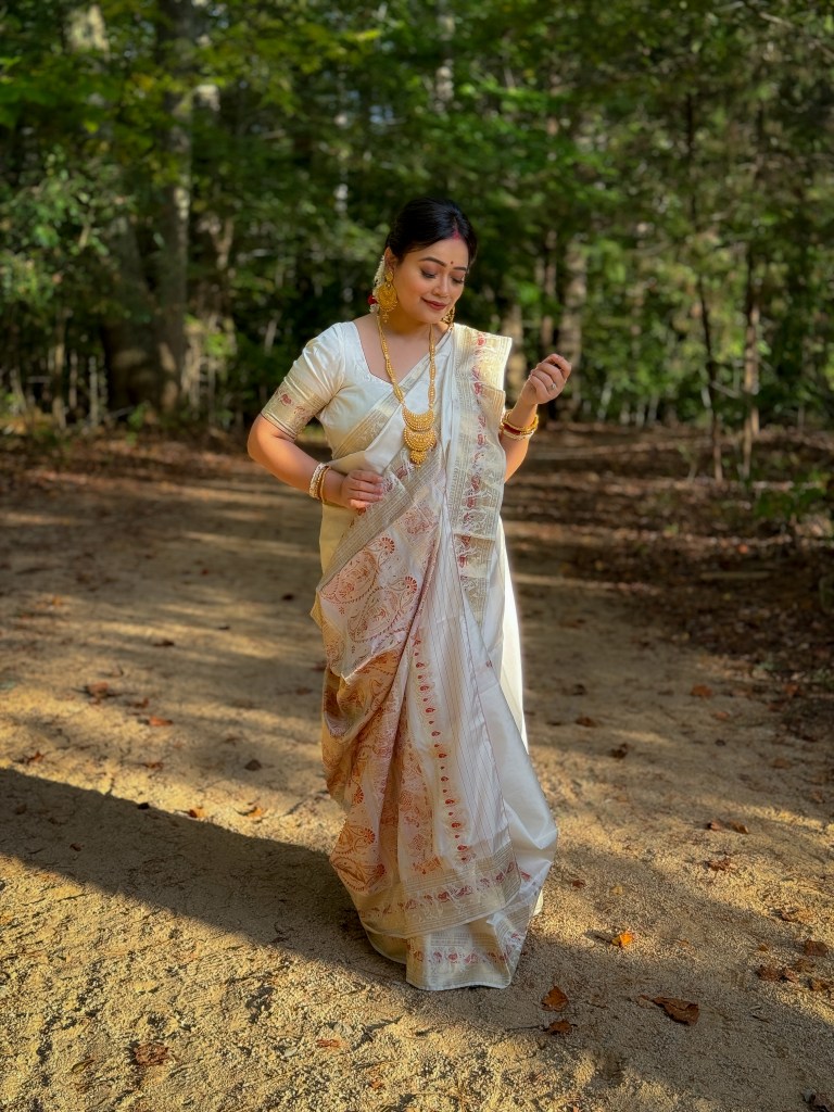 Featuring this hand-spun white base with red golden Swarnachari , an absolutely Bengal’s own creation in white red ensemble. Hope you love our look.