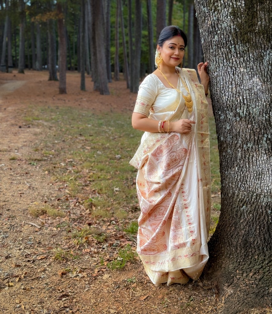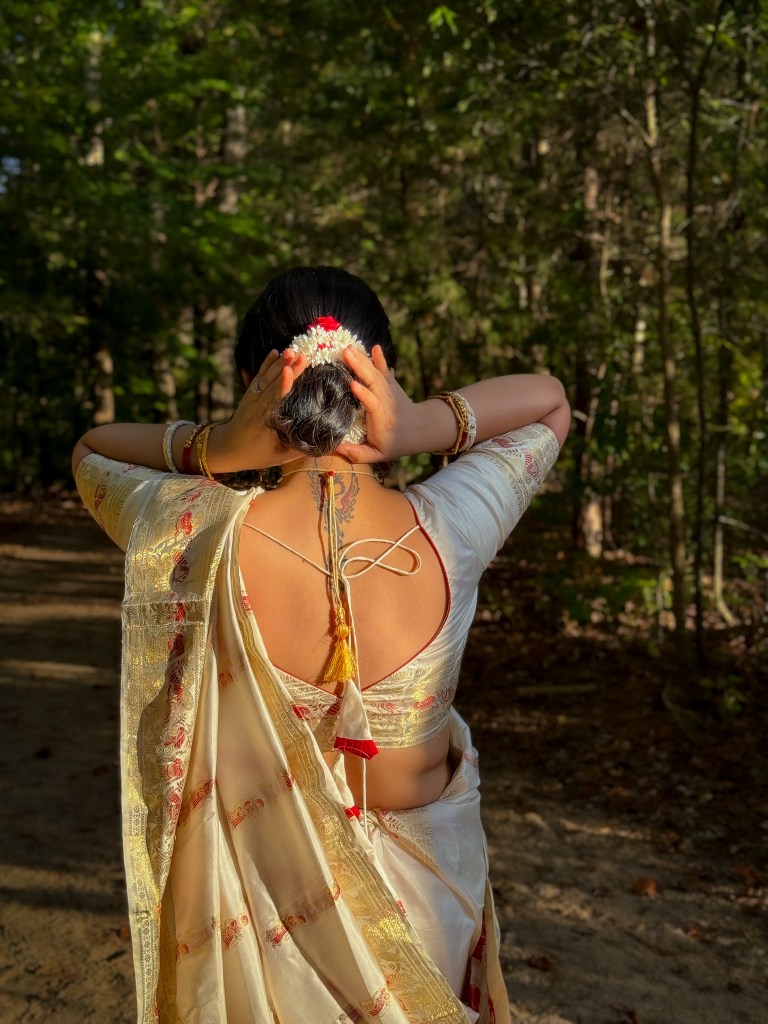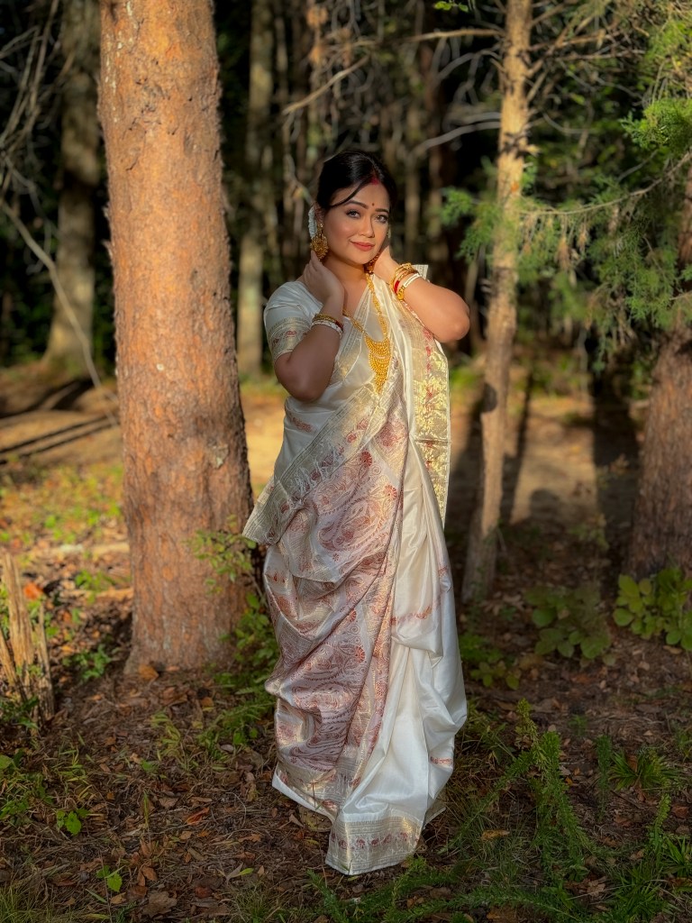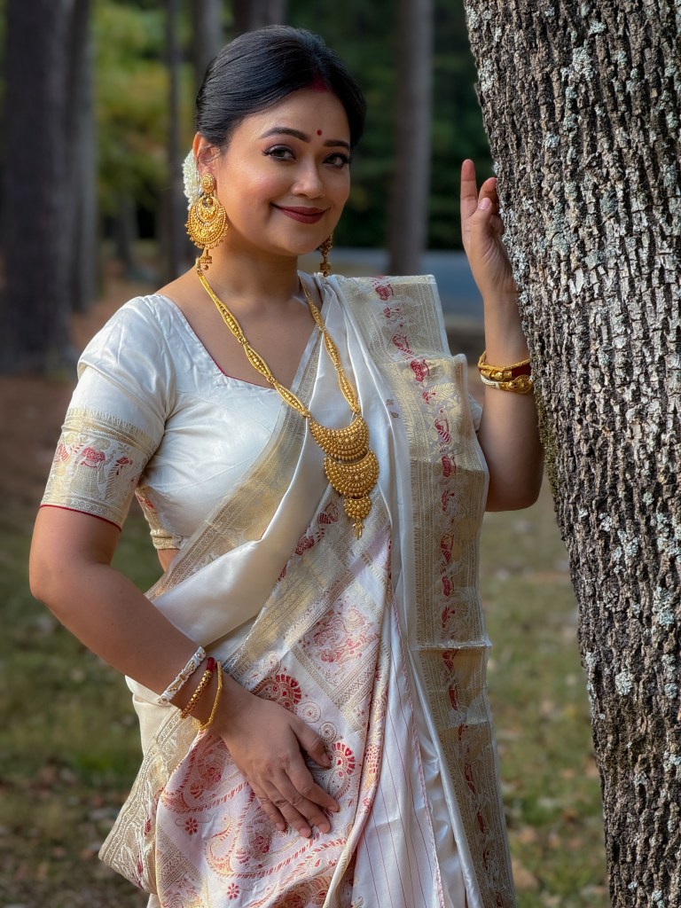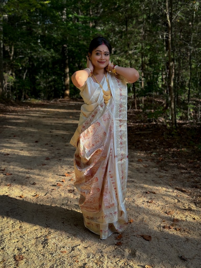 Featuring this hand-spun white base with red golden Swarnachari , an absolutely Bengal’s own creation in white red ensemble. Hope you love our look.