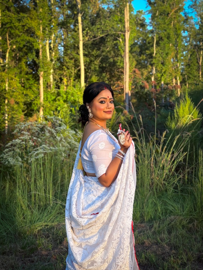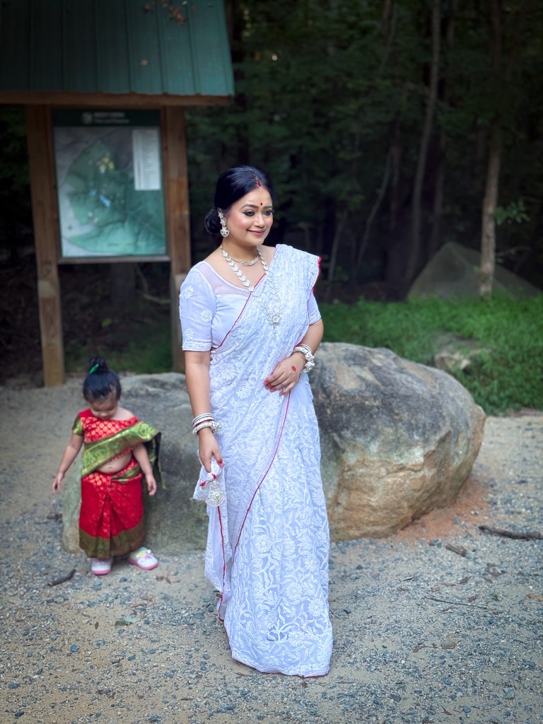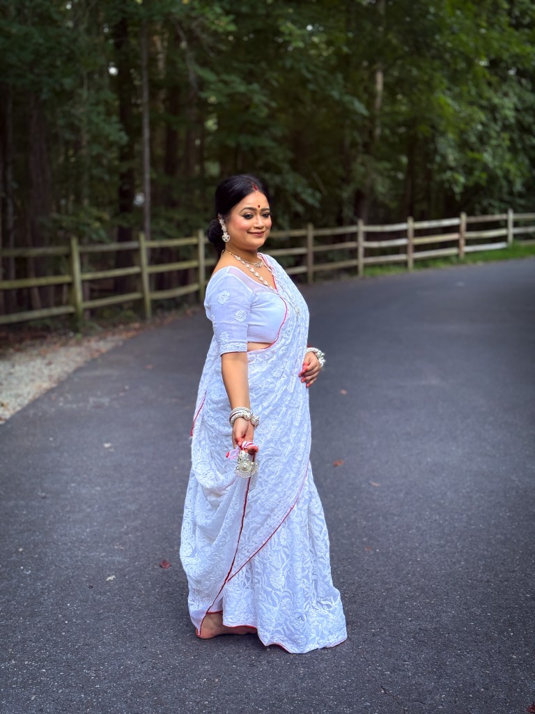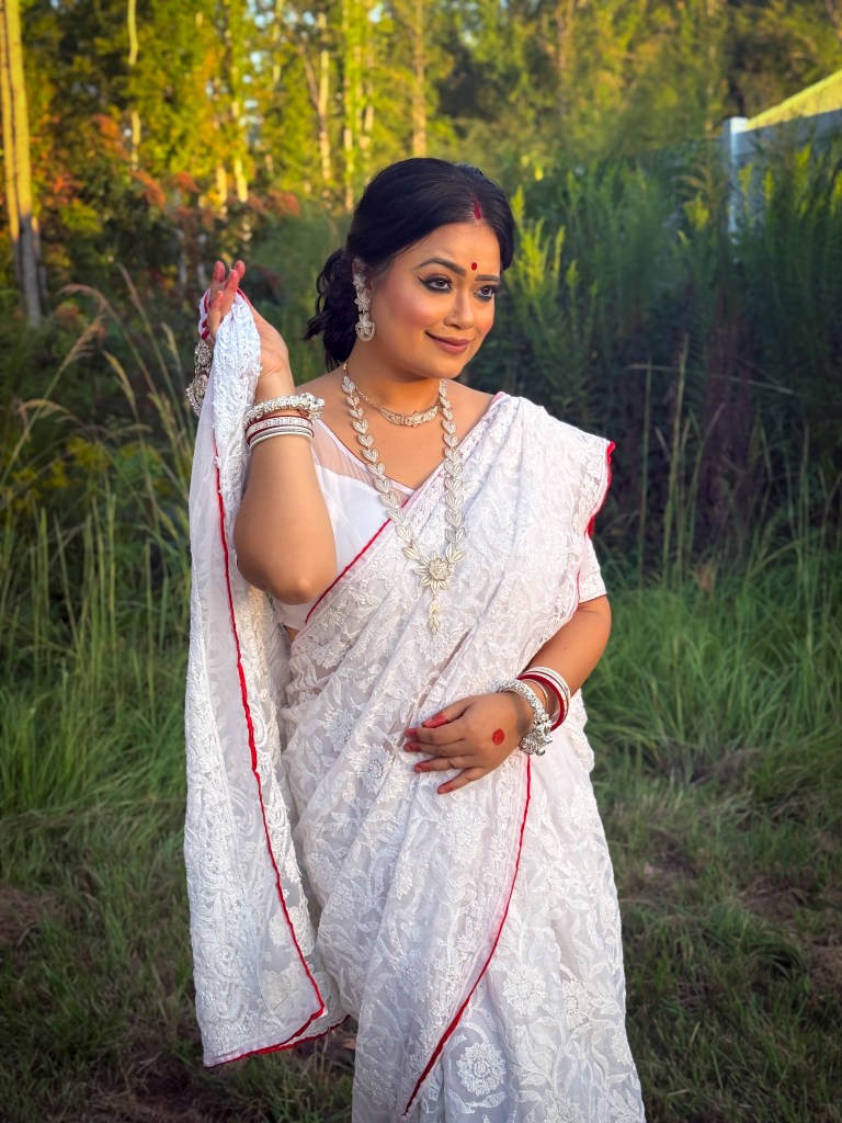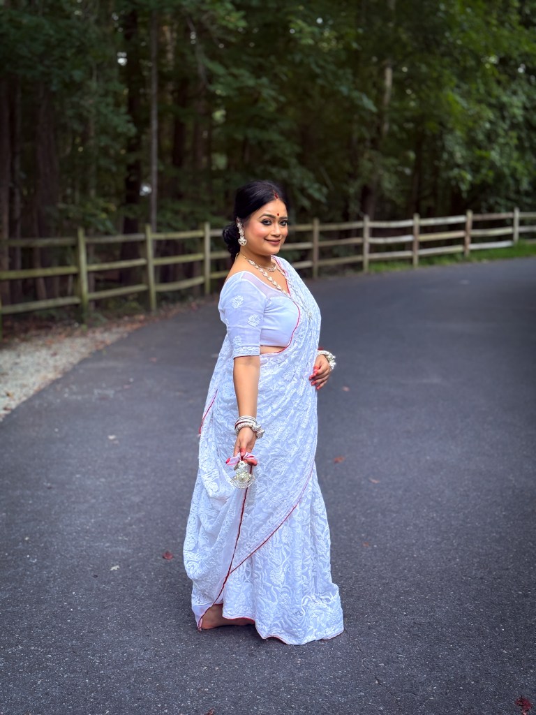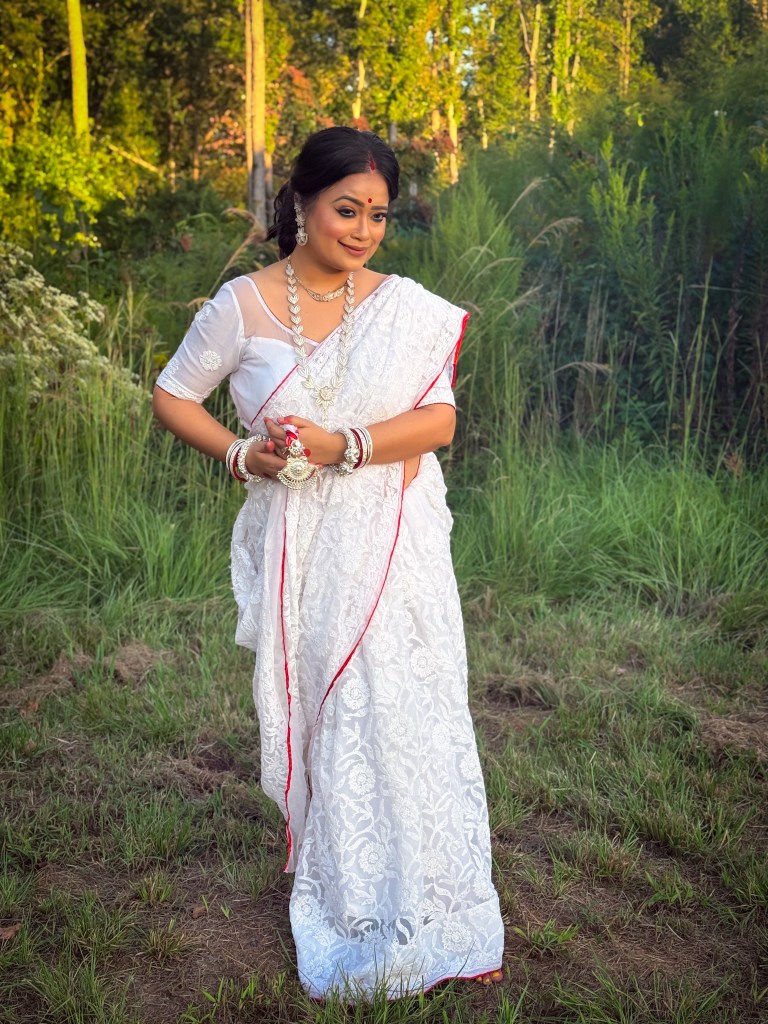 Pujo, the sheer nostalgia. How quickly a year has flown by. So much has happened, and so many things have changed for the better. Some changes I embraced wholeheartedly, while others required battles within myself. Pujo remains an enduring nostalgic feeling for us, a reminder of our past, the good old days. The sound of Dhaak, the fragrance of Parijat, catching up with old friends, late-night pandal hopping, the delectable street food, cleaning up our home, passing through age-old traditions, and celebrating our inner strength—all for Ma Durga’s return to her homeland, as we affectionately call it.